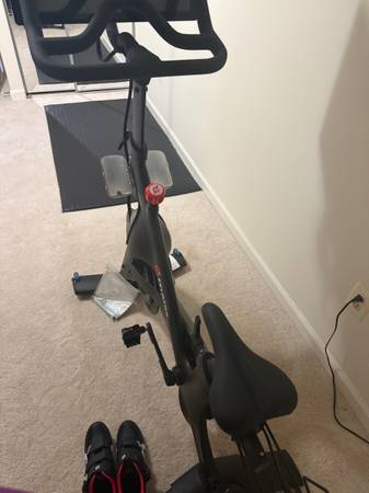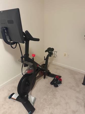 This Peloton bike is a stationary indoor exercise bike that features an integrated HD touchscreen display for live and on-demand workouts, a magnetic resistance system with digital adjustment, and a belt drive for quiet operation. It is built with a welded steel frame and includes features like a headset, USB-C charging port, and a 5-megapixel camera. The bike's design allows for a wide range of users, with adjustable seats and handlebars, and it tracks metrics like speed, cadence, and output