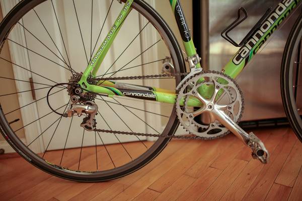 Very low mileage and in excellent condition. Frame Material: 6061 T6 aluminum Frame Angles: 73.0 head, 73.5 seat Size: 52cm Color: Yellow/Green Fork: Cannondale Slice Prodigy (Carbon) Brake Levers:...