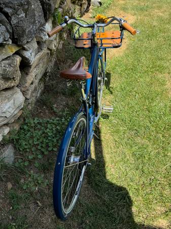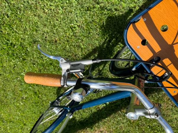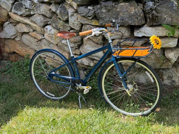 Excellent condition uncommon Specialized “Live 3” model bicycle that has had minimal use, with Gates belt drive 8 speed Nexus internal gear rear hub with trigger shifters, Tektro hydraulic disc brakes, large porteur style front rack rated for 20 kilos / 44 lbs, with wrap-around rail and wood deck, full coverage fenders, belt-guard, twin-leg kickstand, front end spring-centering device, eccentric bottom bracket, etc, etc, in a compact, low standover height frame size. [I’m not sure why Specialized named this model “Live 3”, but haven’t researched the origin of the name. In any case, identifying it from archived photos and specifications has been a simple matter. I had previously thought it was a “Globe 8” because of the 8 speed hub.]