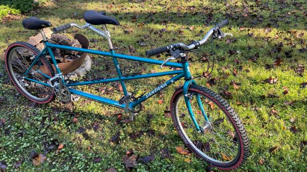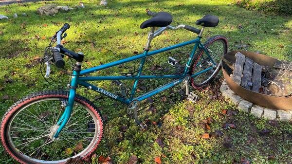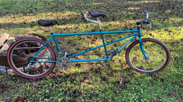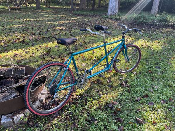 This is a semi off-road tandem bike that would be great for a couple bike camping along the C&O Canal or weekend cruising. It has been very little used since new and is ready to go as is. It has excellent components as you can see. Tires are essentially new. It’s nice.