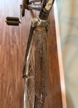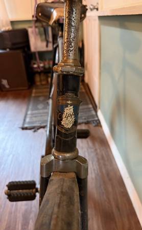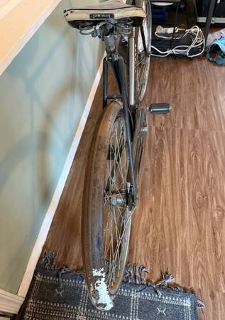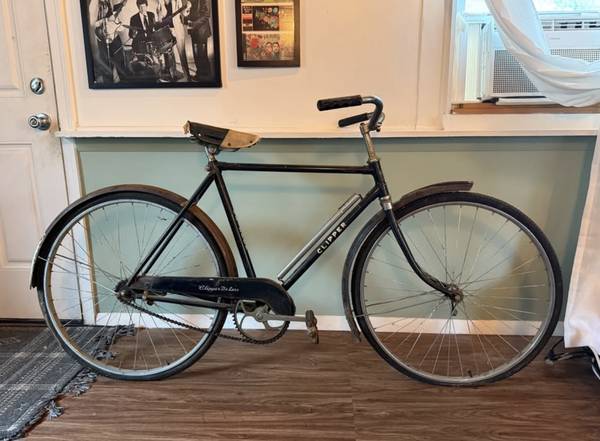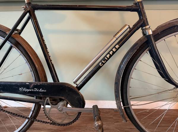 Mid-century Clipper roadster bicycle. I think this was originally made by Raleigh for department stores. Single speed, original fenders, chain guard, seat and handle bars. Perfect for someone looking to restore it. Tires need to be replaced and the wheel hubs are rusted.