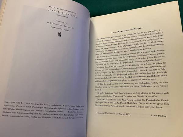Chemie Eine Einführung by Linus Pauling Introduction to Chemistry by Linus Pauling in German hardcover from 1956. 624 pages Excellent condition. German language