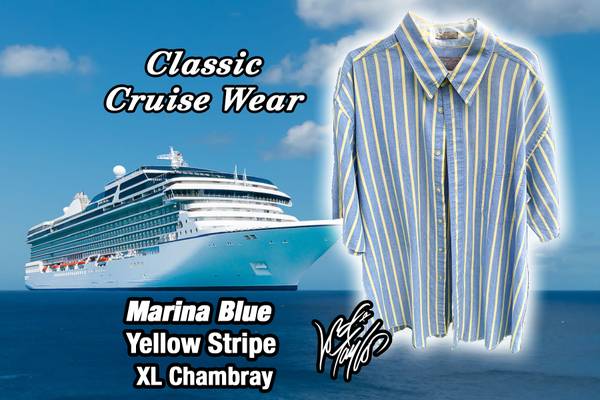 CRUISE WEAR-Marina Blue /Yellow Stripe XL Cotton Chambray Mens Shirt...