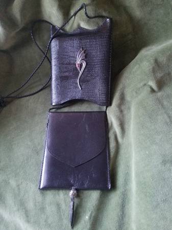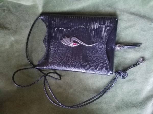 Stunning black alligator and leather bag with silver accents and faceted stone for eye. Outer cover slides to reveal purse with flap. Eight and a quarter inches tall by six and a quarter inches wide.