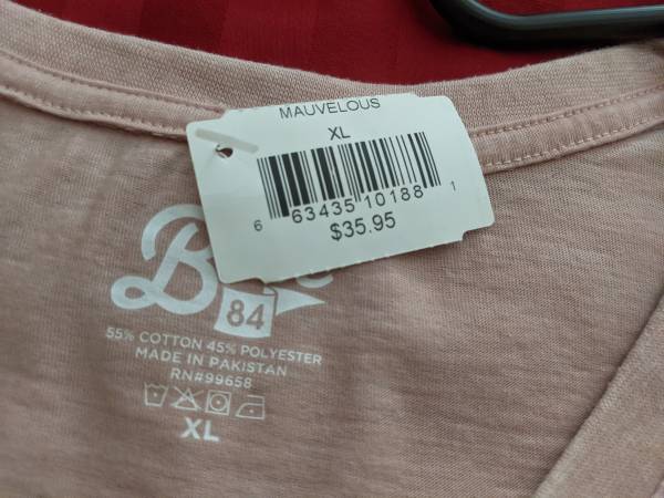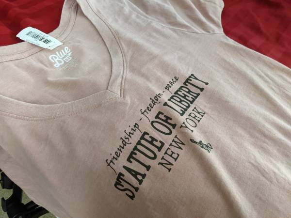 Bought Statute of Liberty V-neck Pink T-shirt from Liberty Island where the Statute of Liberty is located. There were no dressing rooms at that location. Don't need this shirt. Tag still on. See all pics for details on size and materials. Can't try on beforehand. $35 OBO. Cash preferred or Zelle (most secure EFT). The V-neck is VERY wide. Proof of what I paid is in pics.