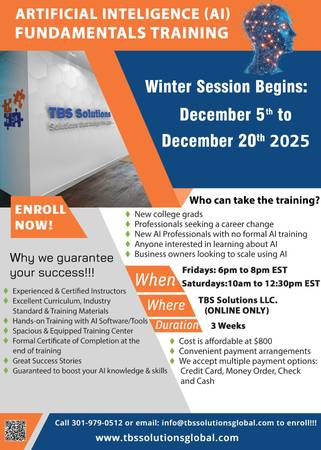 A new Artificial Intelligence (AI) Fundamentals training starts on Friday December 5th, 2025. The training duration is 3 weeks.