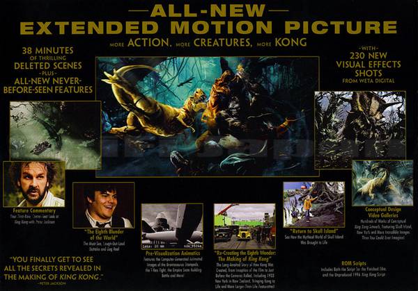 The King Kong Deluxe Extended Edition is an all-new, action-packed DVD experience! Director Peter Jackson has added more than 13 minutes of never-before-seen footage, including the heart-stopping excitement of a charging Ceratops, the adrenaline rush of a Skull Island underwater creature's attack and so much more. Plus, this Deluxe Extended Edition is loaded with hours of brand-new special features, including a riveting commentary, behind-the-scenes featurettes, an outtake and gag reel, along with over 38 minutes of thrilling deleted scenes! The extended version of Peter Jackson's King Kong adds 13 minutes to the running time--fortunately those 13 minutes include two dynamic action scenes and no material has been added to the movie's belabored set-up, which tries to give depth to these quintessentially b-movie characters with a clumsy patchwork of melodrama and in-jokes. But once movie-maker Carl Denham (Jack Black, School of Rock) and his crew finally arrive at Skull Island, the movie kicks into gear with spectacular action, technical wizardry, and genuine feeling. Though Kong seems crafted to dazzle the eye on the giant screen, the overlong structure improves when you can take an intermission at will.