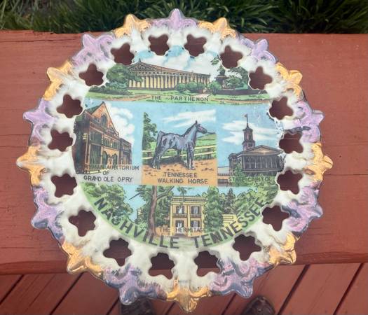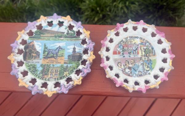 Pair of Nashville, Tennessee souvenir plates from the 1950’s. The smallest of the two highlights the Grand Ole Opey. It measures 5” in circumference. The other spotlights multiple Nashville attractions like the state capitol, Parthenon, the Hermitage, Horse country and the Grand ole Opey. Ir measures 6” in circumference. Both are ready to be hung in wall pencils be displayed on shelf.