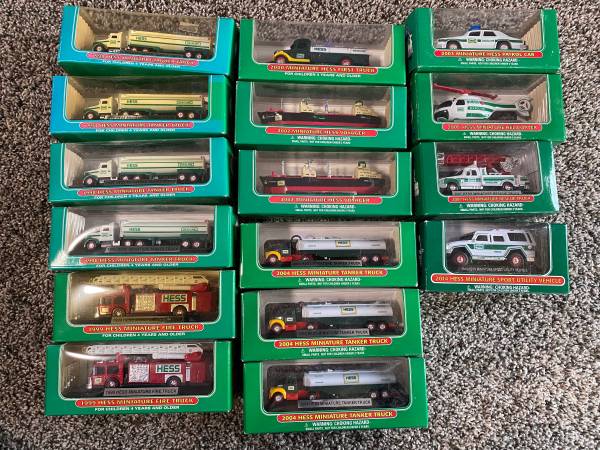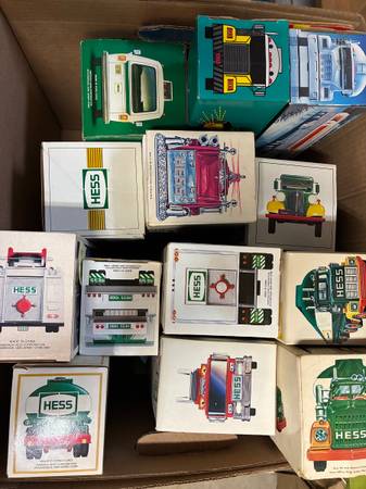 Over 130 different trucks in their original boxes, from the 1970’s to the 2000’s. Most are Hess, but also have Servco, Wilco and others. Also have some mini trucks too.