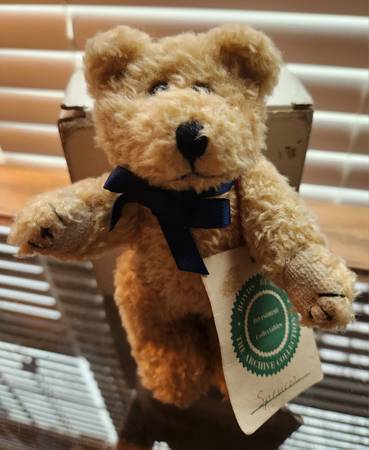 Spencer is fully jointed and hand embroidered and has the look and feel of an antique bear. Each bear is handmade and as such no one looks exactly alike. Features: Tan bear with blue bow and stitched claws. Suitable for ages: 3 and up. Kept as collectible. Never played with. Tag attached.