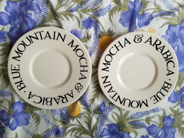 Dinner Plate "Bacon and Egg" mp"Bubble and Squeak". Salad Plate "Toast and Marmalade" "Kedgeree". Pair saucers "Blue Mountain Mocha and Arabica".