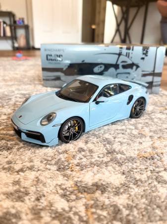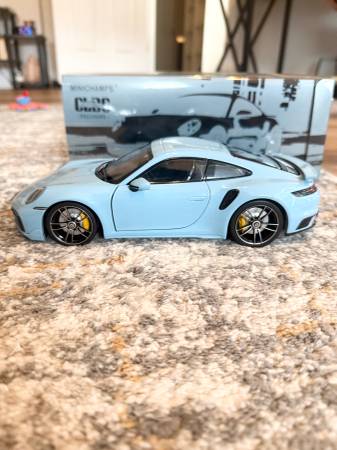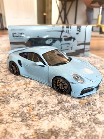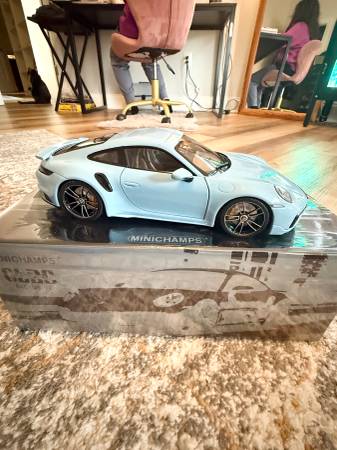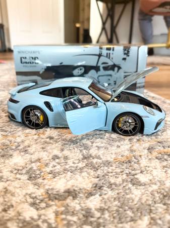 Hello i have here Brand New Minichamps 1:18 Porsche 911 992 turboS in Sky Blue Color 2021 Alloy Full Open Car Model Collection. Only 300 Units made. Beautiful piece. All doors opens including front...