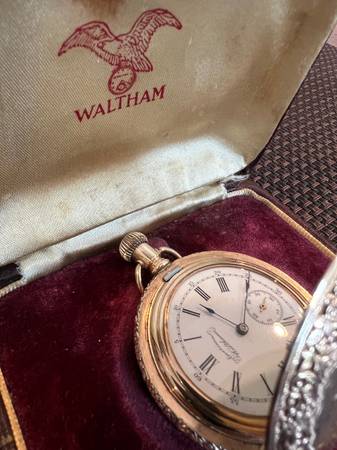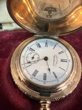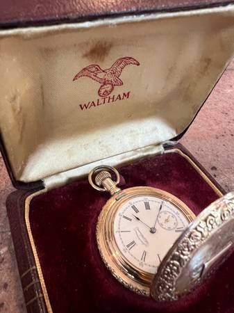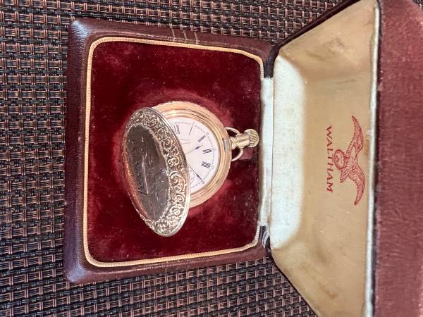 This is beautiful. There are no markings but it has some gold, there is some rose gold on this as well (Not acid tested) so assume gold filled. Has beautiful etching on front and back. there is some tape residue on it because the little clasp is bent and it won’t stay closed so it had to be taped. It needs to be serviced. It is such beautiful shape aside from the closing issue. Measures 2" across. The face is glass and comes off to reveal a beautiful watch face underneath. The box is real nice Waltham but don’t know if its original to this watch.