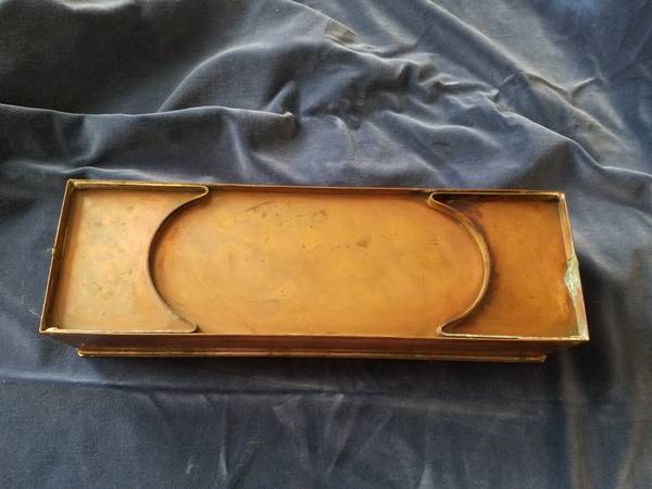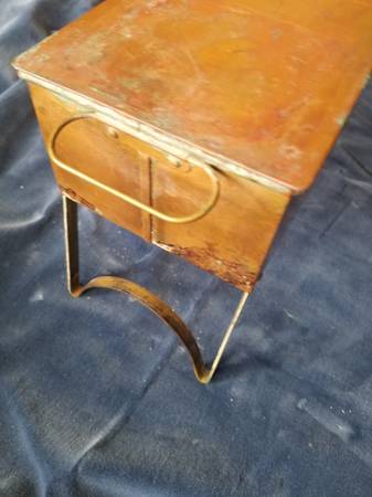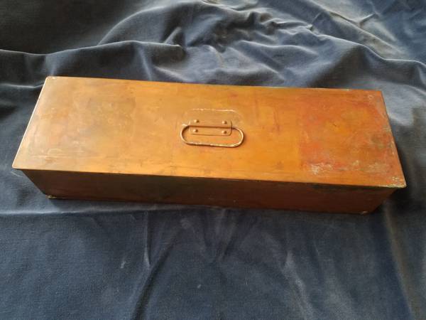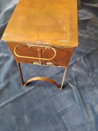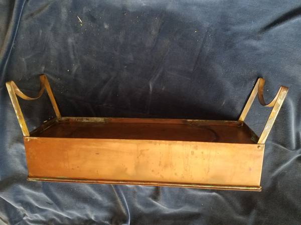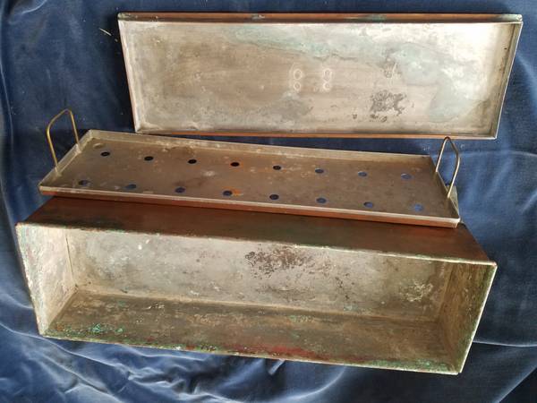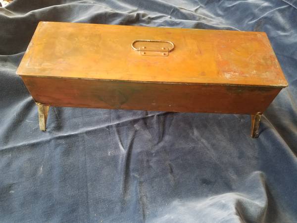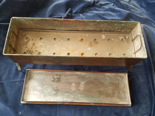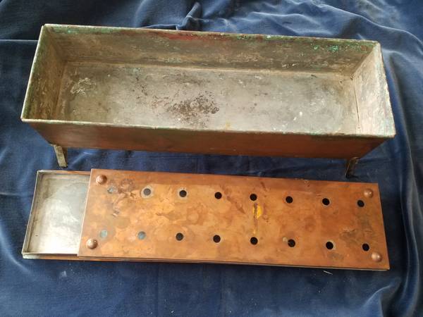 Unusual copper fish poacher with folding legs, lid, handles, tinned interior, and insert basket. Unpolished with patina. Great addition to antique copper collection or for use. Fifteen and poa half inches by five inches by three and a quarter inches. With legs unfolded, six and three-quarters inches tall.