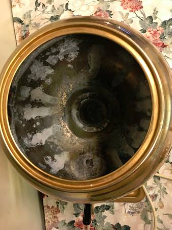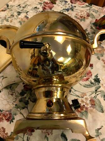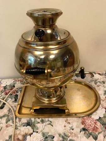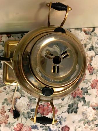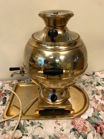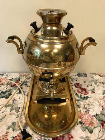 This is NOT a Russian Samovar but likely of Arabic or Middle Asian origin. I think it made from a gold plated steel with tin coated interior. It is electric, takes ~600 Watt power from US standard 120 volt outlet. Has 15” height, 14 “x12” horizontal dimensions (with handles and tap), sphere ~9” in diameter. Can hold up to 6 liters (~1.5 gallon) water, when half full it take ~30 min to boil it at maximum power. Than power can be reduced just to keep water hot and use when necessary. Tap works fine, with not more than 1-2 drops per minute, that is considered normal for old style Samovars that have no synthetic gaskets, just metal. Under the tap there are spots of tin used for tap soldering, other than this there are only minor cosmetic defects (see pictures).