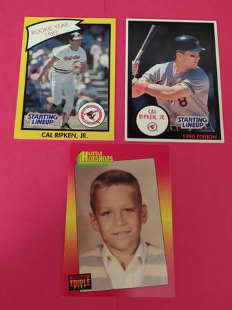 Cal Ripken Jr - Elected to Baseball's Hall of Fame. Lot of 7 Mint Specialty Baseball Cards. Lot G includes the following: 1990 Starting Lineup - 1989 Starting Lineup - 1992 Donruss Triple Play Little Hotshots - 1991 Scoe All-Star - 1992 Topps All-Star - 1990 Fleer Player of the Decade - 1989 Topps Cap'n Crunch.