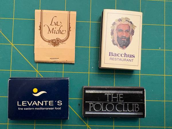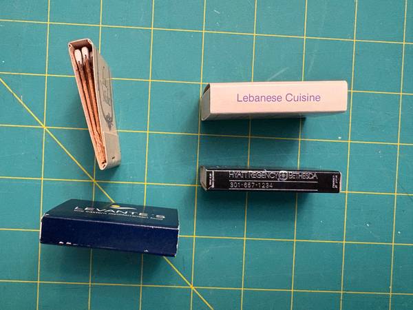You are purchasing three (3) matchboxs and one (1) matchbook from restaurants located in Bethesda, MD. This is a cash only sale and pick-up will be near Holy Cross Hospital (Silver Spring).