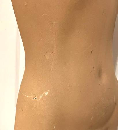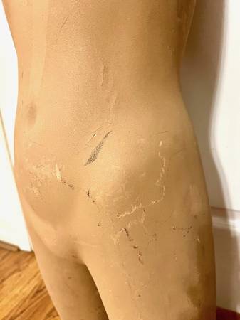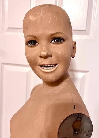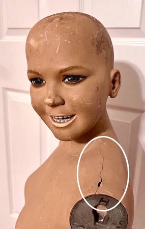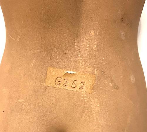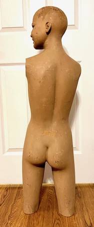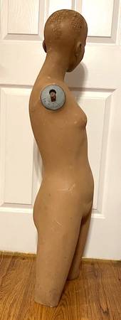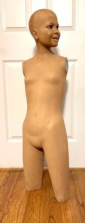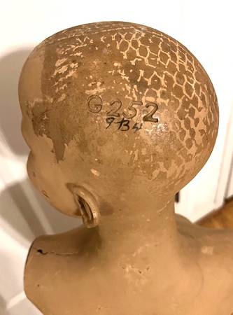 Unique youth/child mannequin, guessing 1940s or 1950s. Head and torso, all one piece; no arms. Stands about 42" tall. Model G252, which is stamped on top of head and on small of back. Wonderful painted face! I assume a wig was once attached, as there appears to be remnants of glue covering the head. There is definitely some wear--see photos for most noteworthy crack at shoulder--and dirt, but she has lots of character and history. Last photo is of base simply to show legs are hollow, but mannequin is a single solid piece. Silver Spring, just north of Colesville and off of New Hampshire Ave.