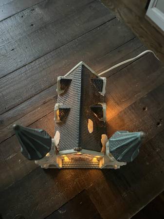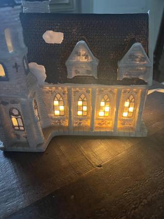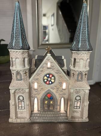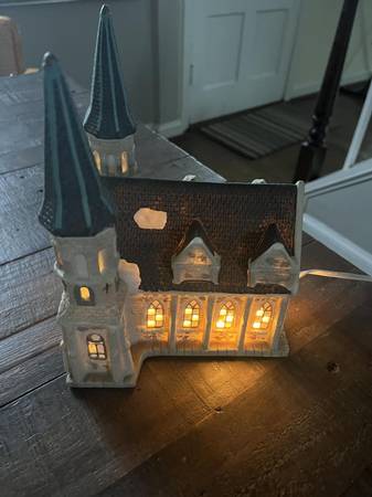 Handsome table top church with twin towers that lights up. Highest point is approx 9 inches, 6.5 inches across and approx 6.5 inches length. New/like new condition. The light has a switch on it....