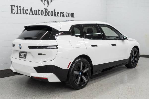 Gorgeous 2023 BMW iX M60 AWD with only 15k miles. One-Owner, Clean Carfax! *MSRP $112,920* Equipped with Executive Pkg, 21" Wheels w/M Sport Brakes, Panoramic Sunroof, Navigation, 3D Surround view Camera, Interior Camera, Adaptive cruise control, Lane Keep assist, Frontal collision warning, Icon Adaptive led headlights, Air suspension, Heated and Ventilated front seats, Heated rear seats, Heated steering wheel, Soft close doors,Apple CarPlay, Bowers & Wilkins Surround Sound, Bluetooth, Usb/Aux, Satellite radio, Glass control, Wireless charging, Power folding mirrors, 4-Zone Climate control, Ambient lighting, Rear privacy windows and many more to list. Finished in a beautiful Alpine White exterior over Black seats. All books and two remote keys. Balance of BMW warranty to December 2026 or 50k mi. SHOWROOM READY!