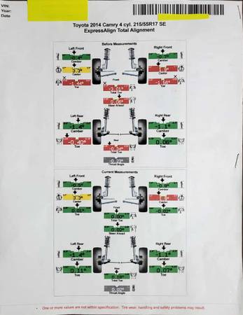 Recent Computerized 4-wheel Alignment (with printout of wheel setting specs)