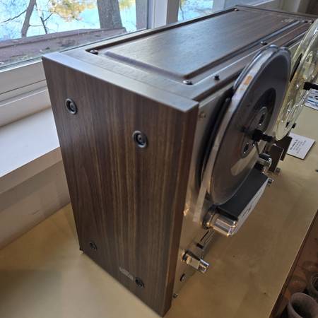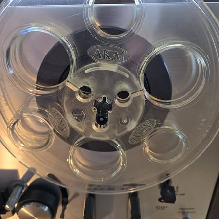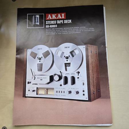 Classic, reliable Akai GX-4000D reel to reel tape recorder/player. Four track, two channel, stereo/monaural system. Twin VU meters, sound on sound recording procedure. Seven inch reels (one tape and one original Akai take up reel are included). Low-noise crystal ferrite GX heads. Original manuals. More tapes are available for additional price.
