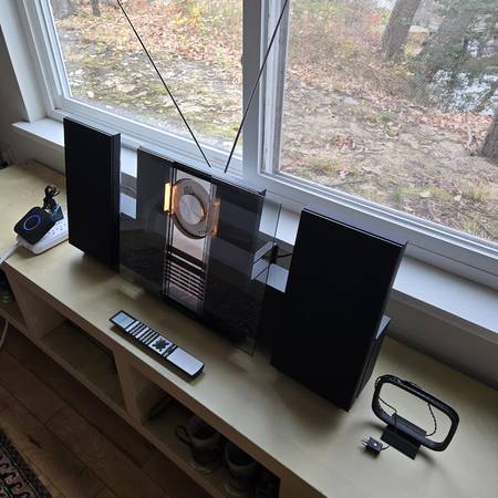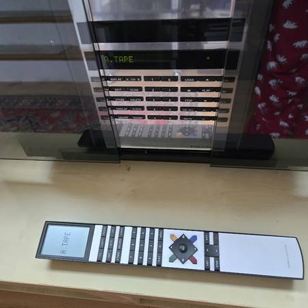 The system has an FM/AM radio tuner and Compact Disk player (random and repeat). Motion Sensor glass door opening. Original remote and a B&O system wall mounting bracket (upgraded re-issue type 2087) included. Also included is the latest model (B06) of a wireless audio receiver 1Mii and an AUX cable to connect it to the system. The system, using bluetooth technology, can play any online music content right from your phone (will demo).