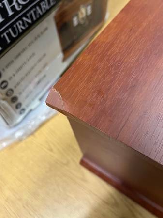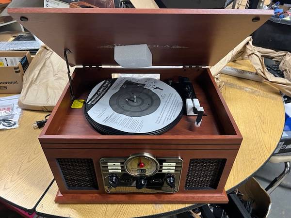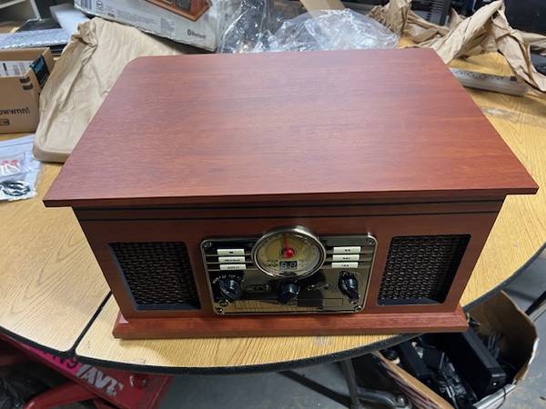 New - Open Box Victrola Nostalgic 8-in-1 Bluetooth Player and Multimedia Center with built-in speakers, offering a 3-speed turntable, CD and cassette player, AM/FM radio, and wireless music streaming. Finished in a mahogany color. No additional cables needed—simply plug in and enjoy. Small crack on top left.