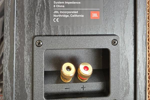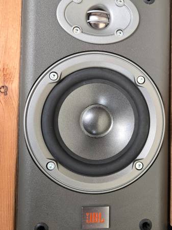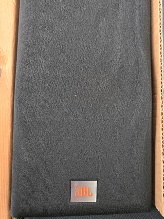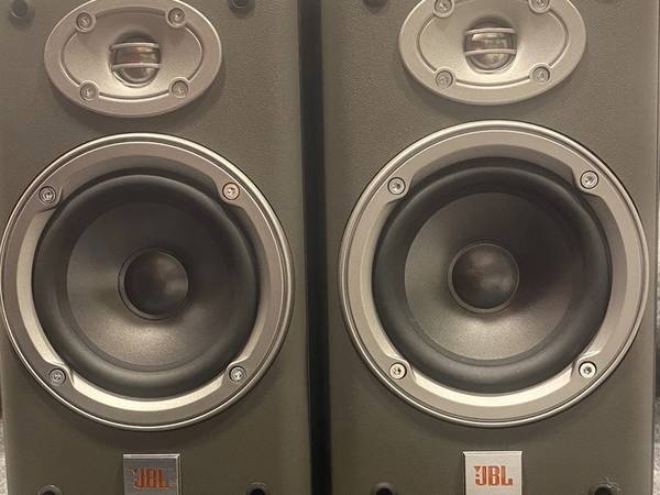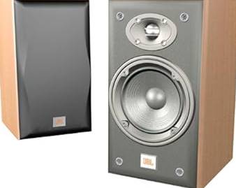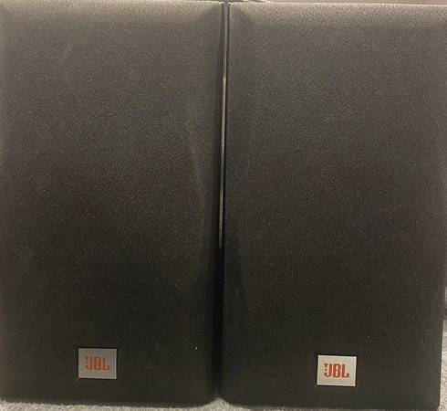 The brand is JBL, and they are designed as bookshelf speakers for a compact setup.