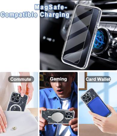 Meshine Magnetic for iPhone 15 Pro Case Sparkly [Compatible with MagSafe], [2 Screen Protector & 2 Diamond Camera Lens Protector], Cute Slim Crystal Full Body Drop Protective Case 6.1", Clear Glitter