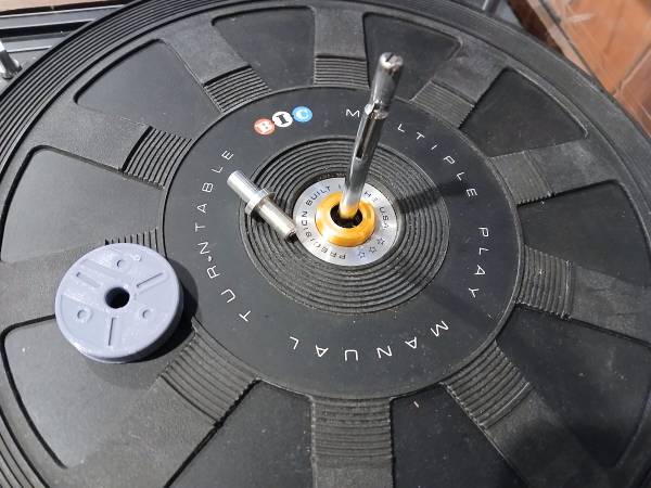 This great, made in USA, high end turntable from 70-th was professionally serviced and now has all mechanics and electronics in a good working order. The original dust cover has no cracks and only minor surface scratches. SURE M7D magnetic cartridge* alone cost about the same as the turntable itself. Two accessories were missing when I got it: a short, single-play spindle, and 45-rpm adapter. Now it has machined aluminum spindle and adapter 3D printed from grey PLA plastic.