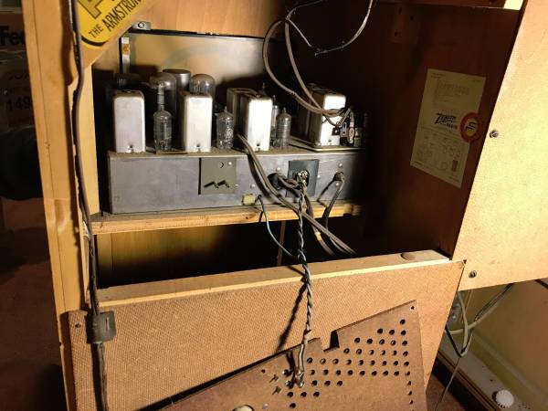 Got it with half working radio, battered cabinet and dead phonograph. Sanded cabinet put three layers of polyurethane and replaced worn canvas. Replaced rubber parts in phonograph: belts, motor anti-vibration mounts and levers inserts. Was unable to find replacement for the original Zenith head and stylus so I installed a modern substitute with diamond stylus. Discovered that it has lower signal output than original one so I added preamplifier to make the phonograph sound volume comparable to the volume from the radio. Also replaced wires with cracked insulation and installed white LED back light for radio dial illumination and red LED's in record player section. Another bonus I added later is a pair of small but highly efficient speakers connected to 3 watt per channel amplifier and Bluetooth receiver.