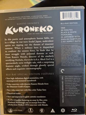 Kuroneko (Kaneto Shindo). Used DVDs for sale in person. No visible scratches on DVD back. Not checked yet for skipping. 1 disc. Price listed above OBO Cash or Zelle preferred.