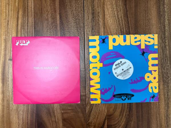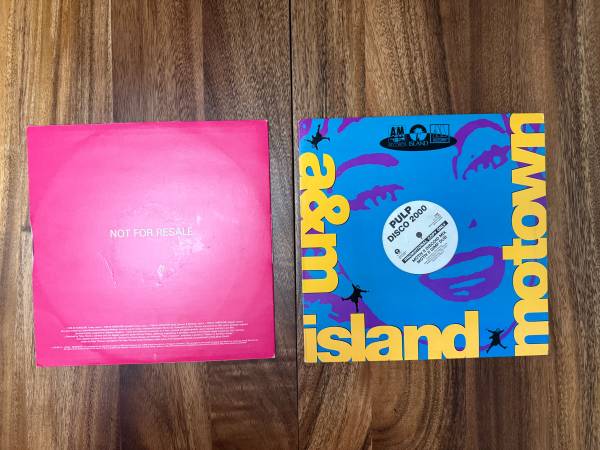 Two pieces of rare Pulp vinyl. Both 12" and 33 1/3 RPM Disco 2000 A1 Disco 2000 (Motiv 8 Discoid Mix) A2 Disco 2000 (Motiv 8 Gimp Dub) B1 Disco 2000 (Chris Thomas Version) B2 Disco 2000 (Album...