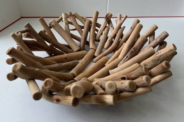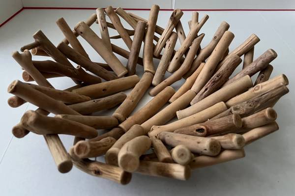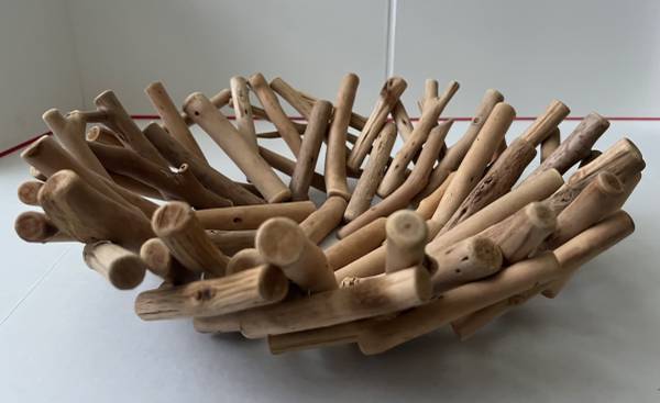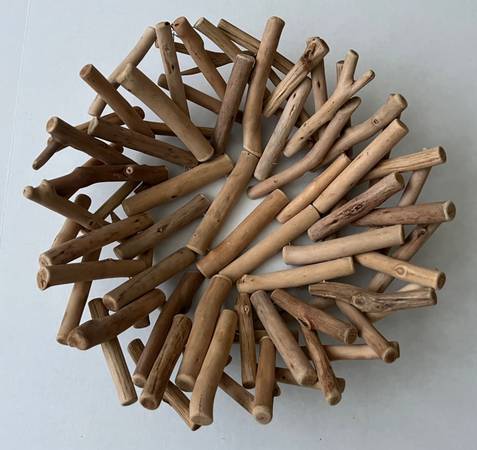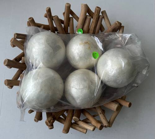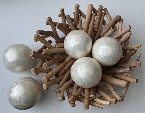 Hand crafted driftwood bowl for $15. Measures: 13 1/2" wide. 5 pearly round orb/balls are $15, I have others to choose from. See my other items with the "more ads by this user" link. ~ Kathy