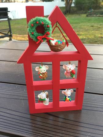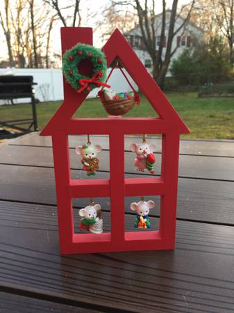A merry little Christmas Display with mice in red house stand for $10. Measures: 7 1/2" high x 4" wide. View the "more ads by this user" link for more items I am selling. ~ Kathy