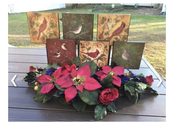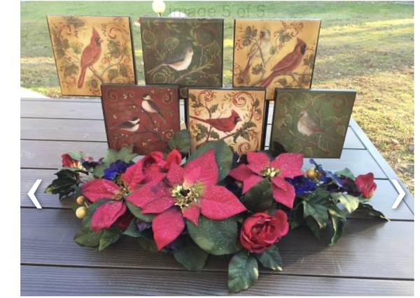 Metal bird display with 6 squares for $15. Measures: Base - 18" long x 4" wide x 13 1/4" high. *See how I used it with the poinsettia silk swag in the photos (also for sale). View the "more ads by...