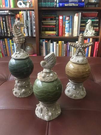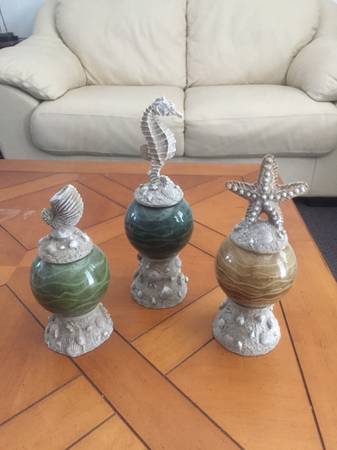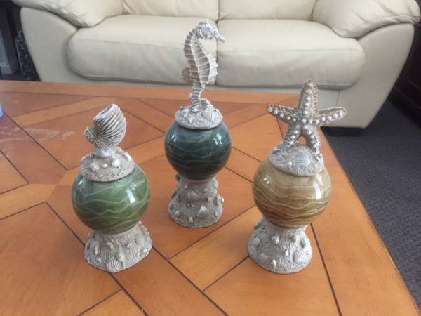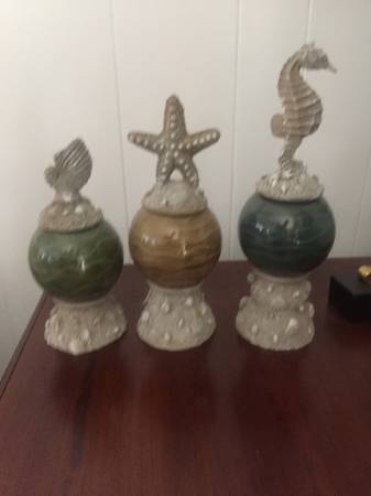 Seahorse, starfish and nautilus set of 3 for $20. Ceramic balls and resin. Measure: 12" - 10" - 9" See the "more ads by this user" link for more items I am selling. ~ Kathy