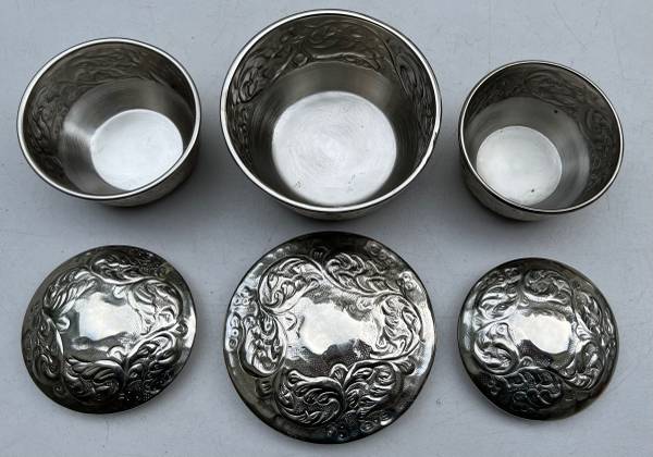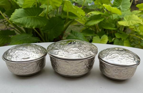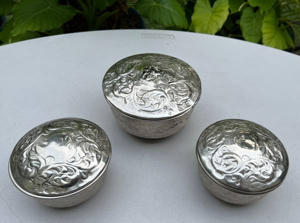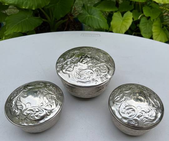 Silver metal boxes made in India: 2 small $5 each one larger is $10. See the "more ads by this user" link for more items I am selling. ~ Kathy