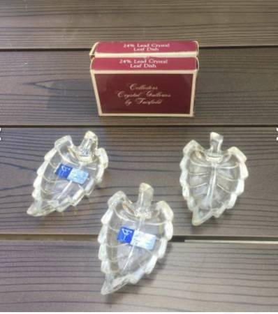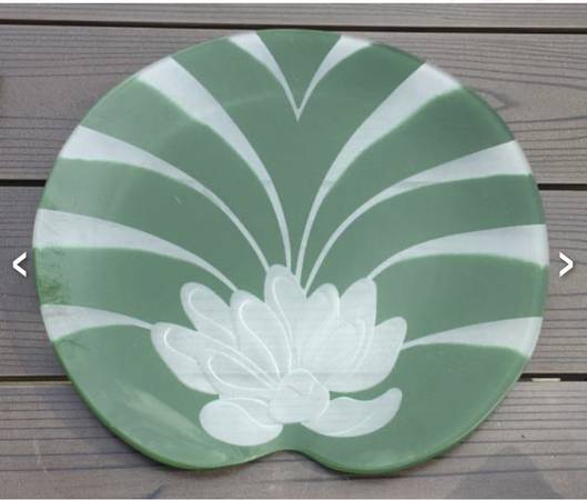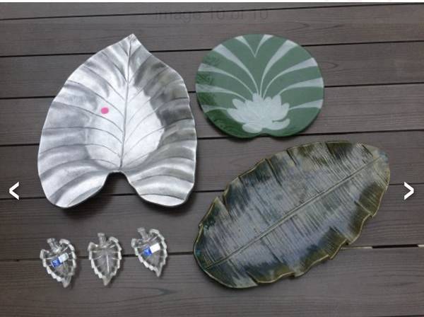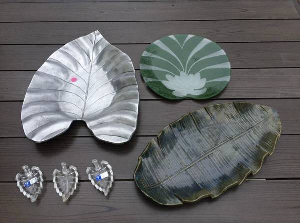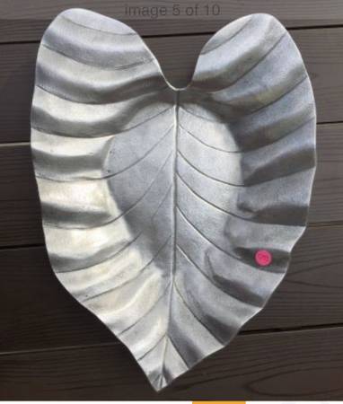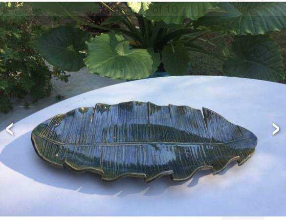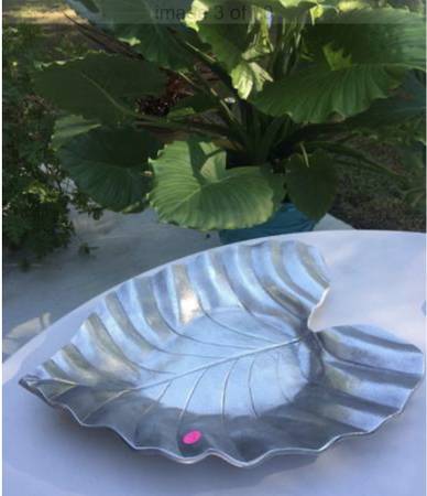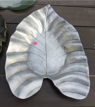 Variety of different leaf dishes. Hand made pottery dark green leaf - $15 measures: 10" x 18". Lily glass dish - $15 measures: 12". Big heavy silver metal (Pottery Barn) - $20 measures: 18 1/2" x...
