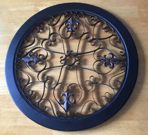 Wood bordered metal center wall hanging off $20. Measures: 18 3/4" See my other postings with the user link. ~ Kathy