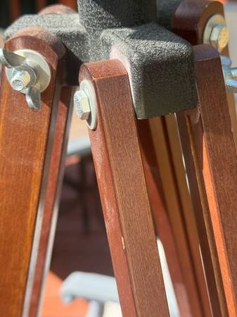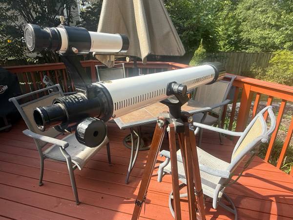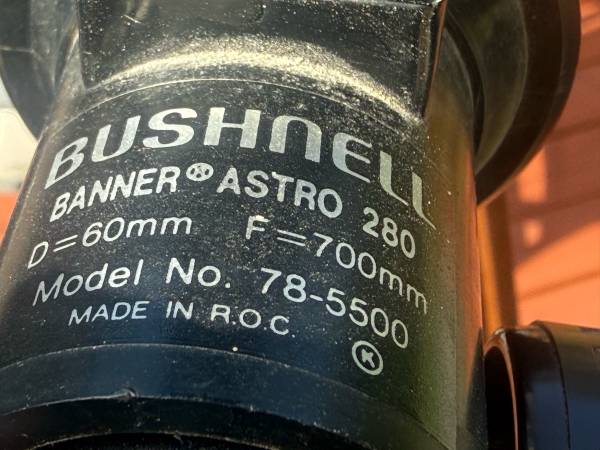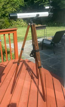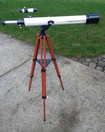 Bushnell 78-5500 telescope and wooden tripod with adjustable leveling legs. Comes with Barlow lens, Elector lens and course scope along with 5mm, 10mm and 15mm eye pieces. Great looking quality telescope that would make a great starter telescope for any young aspiring astronomer.