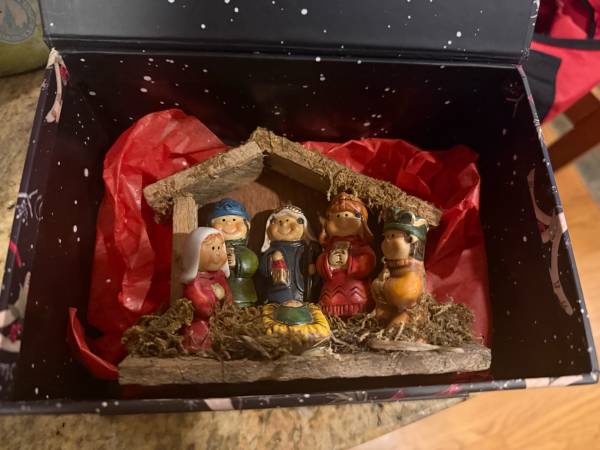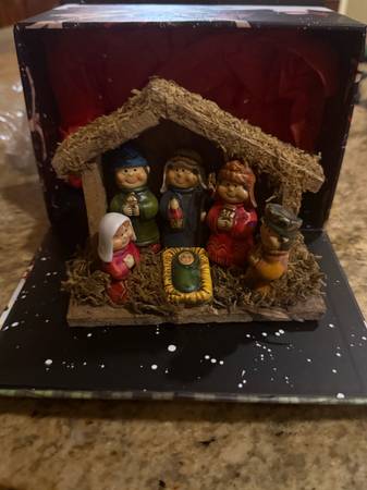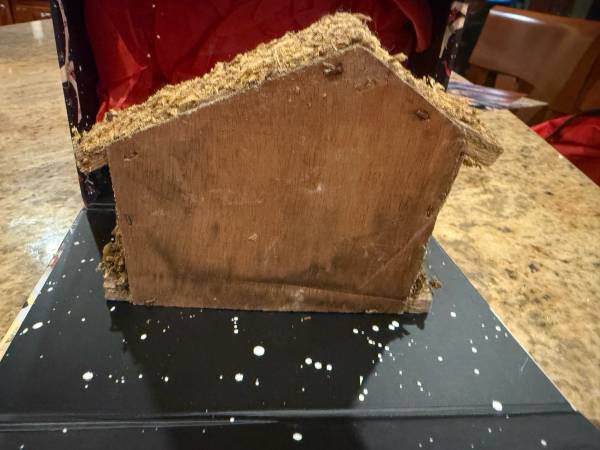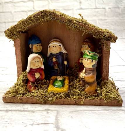 So cute! Place in a small area such as a windowsill. Wooden stable. Figures are plastic and glued down. Nice condition. Nicely detailed with straw. Comes in holiday box. 5 1/2” x 4 1/2” x 2 1/2”