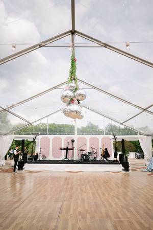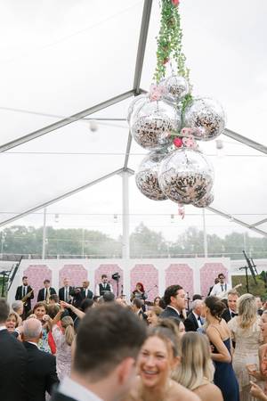 Cluster of Disco Balls: Used one time 12” balls (Quantity 4) 20” balls (Quantity 4) 24” balls (Quantity 3) Chains and eye hooks to hang them included Silk flowers included 6” balls (Quantity: 28)...