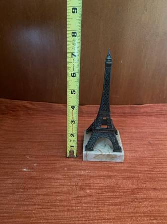 Beautiful metal Eiffel Tower statue on a tan granite slab. Measures 7” height. The granite is 2 3/4” square. Weighs 12 ounces