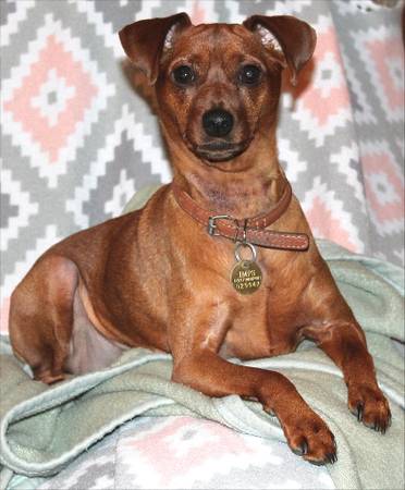 Chloe - 4 year old energetic spayed red female, docked tail, un-cropped ears. 11 inches,11 lbs. Fully vetted, crate trained and microchipped. This little girl is very gentle and sweet and has done well with another female Min Pin at her foster home and has no problem being around cats. She walks okay on leash, a work in progress and loves to be a lap dog. House broken but she's had a few accidents being in a different home Which is to be expected.