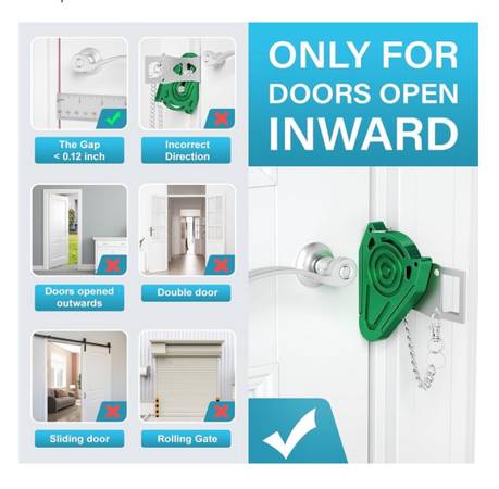 Fit for Door Bolt: 0.75-1.1inch, Door Gap≥1.2inch: - The security door lock is designed with two holes (1.1 inches and 0.75 inches) to fit a variety of door lock sizes. This door safety lock is ideal for use in hotels, apartments, dormitories, rentals, Airbnbs, bathrooms, bedrooms, or private rooms. Warm reminder: This door lock security is only suitable for inward opening doors with a door gap greater than 3mm. ⋆𝐍𝐨𝐭 𝐟𝐨𝐫 𝐄𝐮𝐫𝐨𝐩𝐞⋆