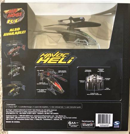 This rare, collectible, remote control toy helicopter is open box, in retail packaging. This is an authentic Air Hogs Spin Master item. This toy is meant for anyone 8 years or older. This helicopter both flies and hovers. It is a lightweight remote control helicopter.