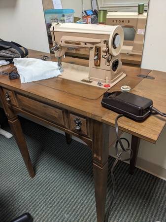 Older Singer sewing machine in good working order. Straight stitch only, no zig-zag. Mounted in cabinet 25" x 19" x 31" tall, opens to 51" wide. Foot pedal, bobbins and needles included. Can see the machine and try it out M, T, or Wed mornings, or by special arrangement on weekend.