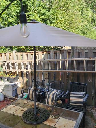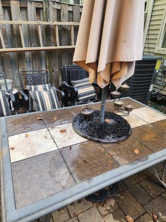 Downsizing and selling a beautiful wrought iron patio set. This set comfortably seats 6 people and includes: